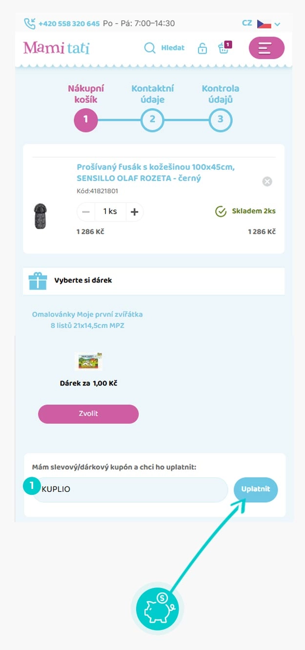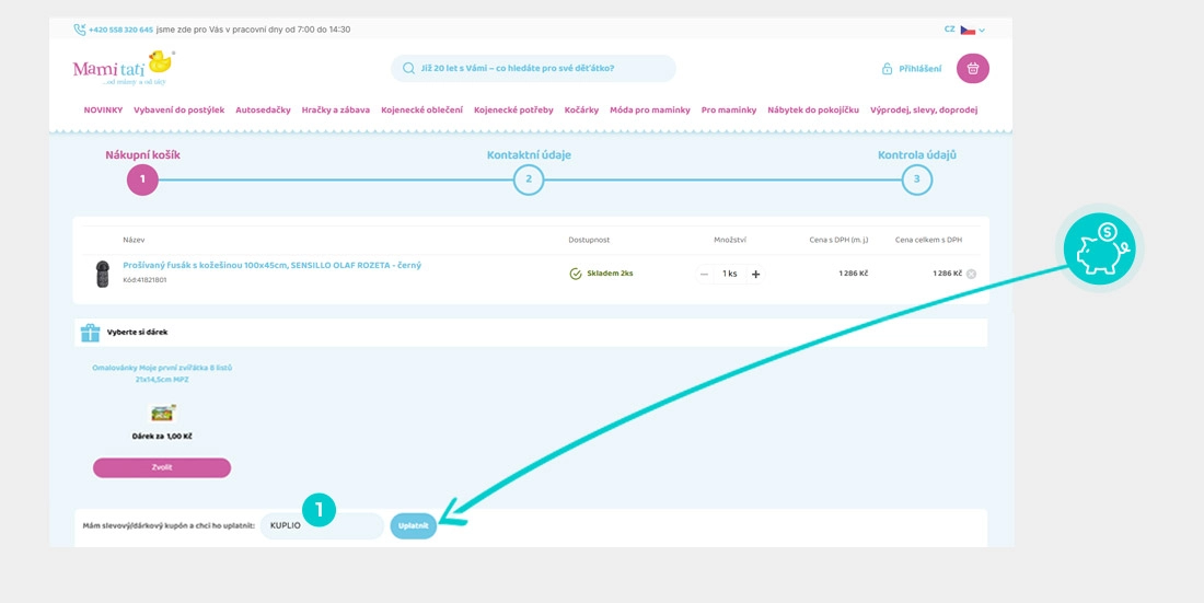 Vyberte si produkt v e-shopu mamitati.cz, o který máte zájem, stiskněte tlačítko "Přidat do košíku" a produkt se automaticky vloží do nákupního košíku. Přímo v nákupním košíku najdete pod vámi vybraným produktem políčko "Kód kupónu". Zde vložte zkopírovaný slevový kód nebo jej ručně vepište a potvrďte tlačítkem "Použít kupón".