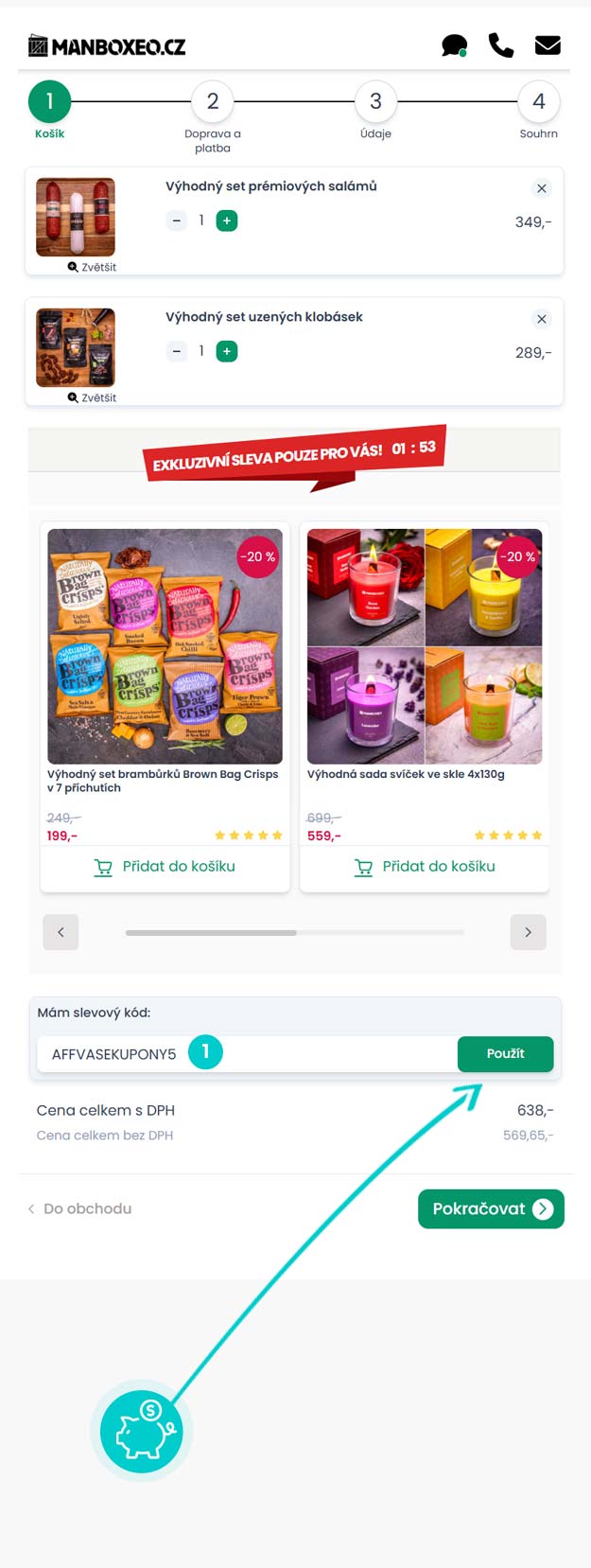 Vyberte si produkt v e-shopu Manboxeo.cz, o který máte zájem, stiskněte tlačítko "Přidat do košíku" a produkt se automaticky vloží do nákupního košíku. Přímo v nákupním košíku najdete pod vámi vybraným produktem políčko "Mám slevový kód". Zde vložte zkopírovaný slevový kód nebo jej ručně vepište a potvrďte tlačítkem "Použít".