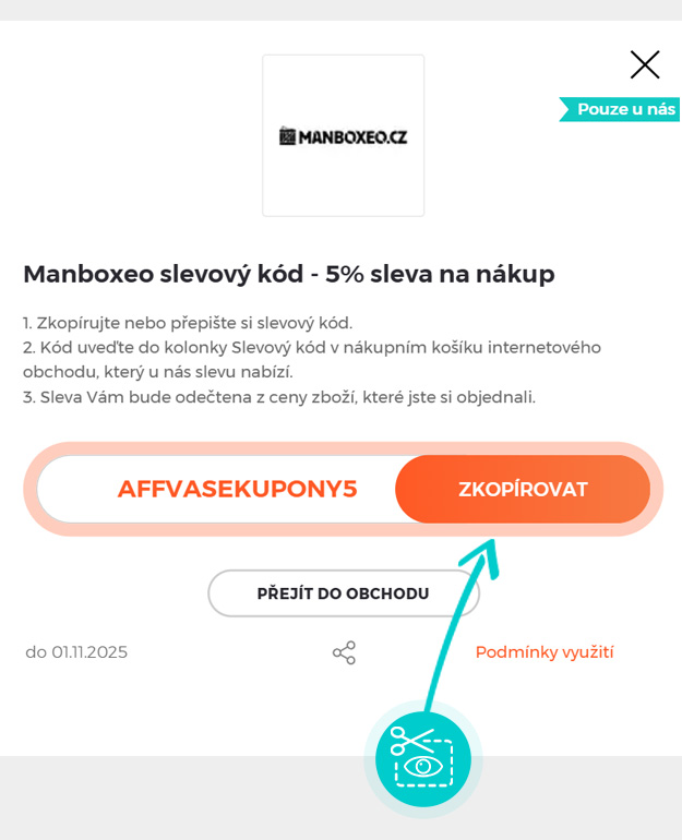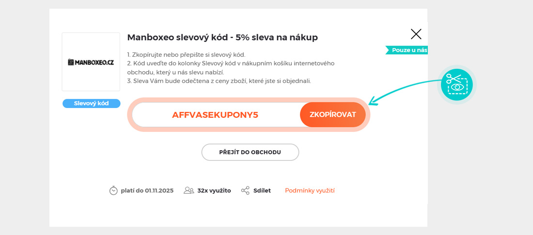 Zkopírujte nebo si opište slevový kód a klikněte na tlačítko "Přejít do obchodu". Následně budete přesměrováni přímo do e-shopu Manboxeo.cz.