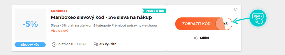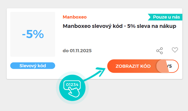 Vyberte si konkrétní slevový kód na naší stránce, který si chcete uplatnit v e-shopu Manboxeo.cz. Klikněte na oranžové tlačítko "Zobrazit kód".