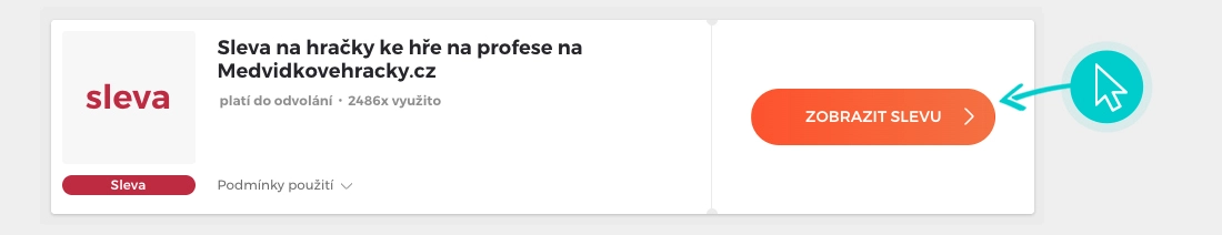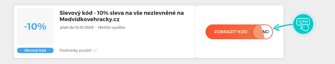 Vyberte si konkrétní slevový kód na naší stránce, který si chcete uplatnit v e-shopu MedvídkovéHračky.cz. Klikněte na oranžové tlačítko "Zobrazit kód".