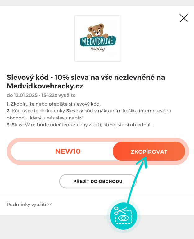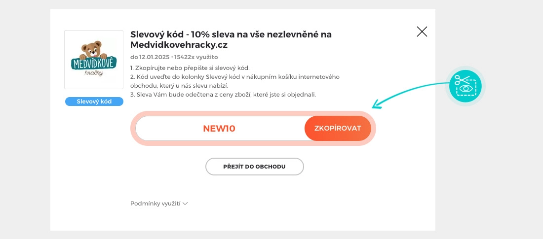 Zkopírujte nebo si opište slevový kód a klikněte na tlačítko "Přejít do obchodu". Následně budete přesměrováni přímo do e-shopu MedvídkovéHračky.cz.