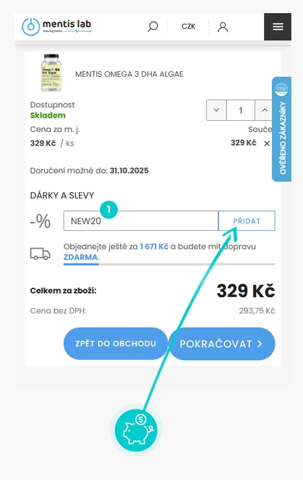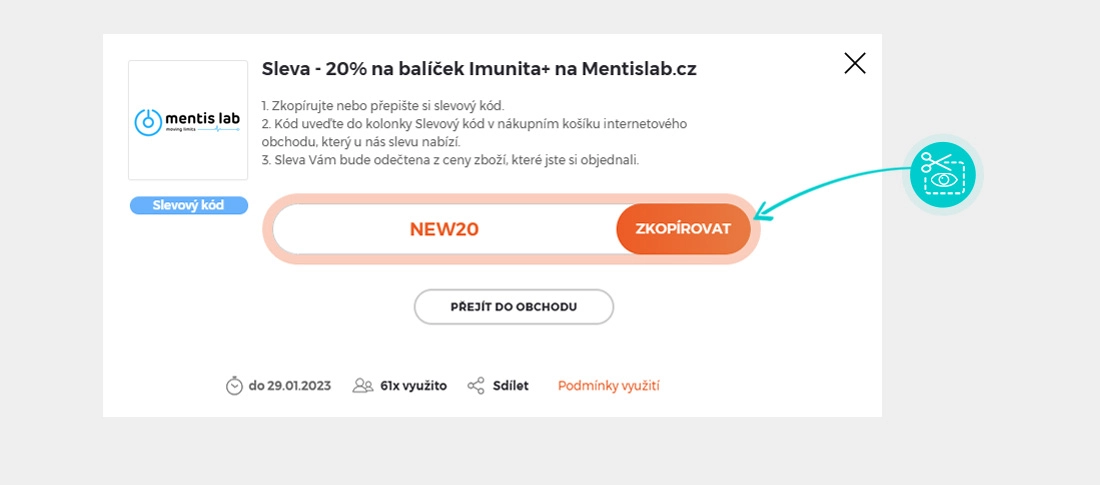 Zkopírujte nebo si opište slevový kód a klikněte na tlačítko "Přejít do obchodu". Následně budete přesměrováni přímo do e-shopu Mentislab.cz.