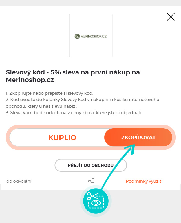 Zkopírujte nebo si opište slevový kód a klikněte na tlačítko "Přejít do obchodu". Následně budete přesměrováni přímo do eshopu Merinoshop.cz.