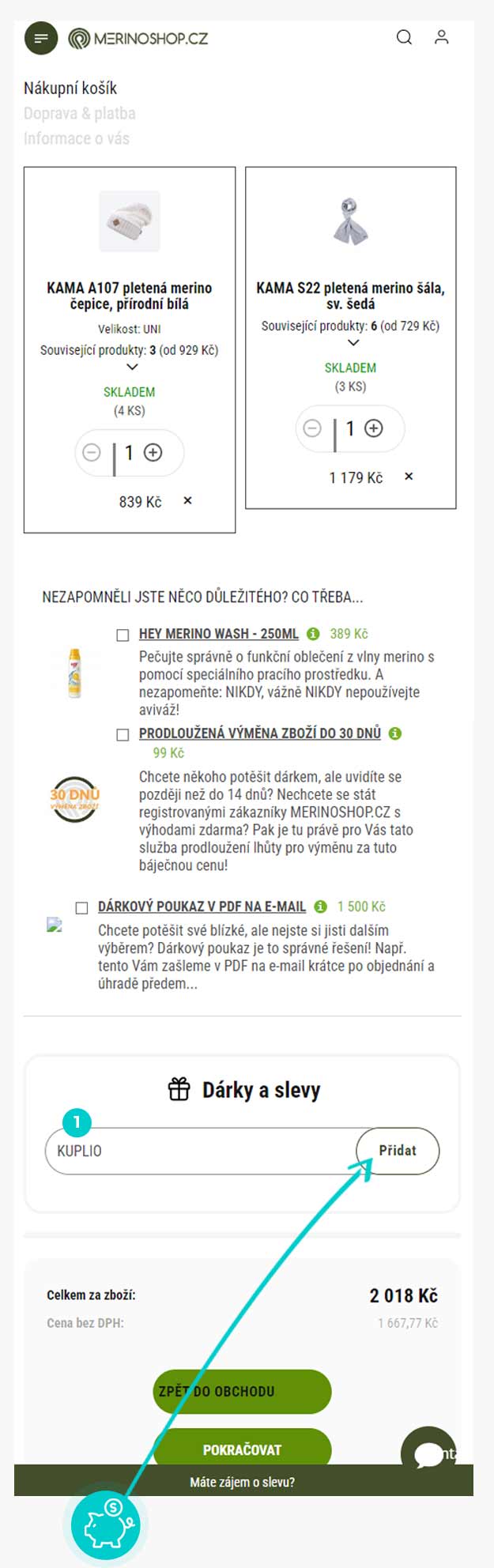 Vyberte si produkt v eshopu Merinoshopz.cz, o který máte zájem, stiskněte tlačítko "Přidat do košíku" a produkt se automaticky vloží do nákupního košíku. Přímo v nákupním košíku pod vybranými produkty klikněte na políčko "Vložit kód slevy". Zde vložte zkopírovaný slevový kód nebo jej ručně vepište a potvrďte tlačítkem "Přidat".