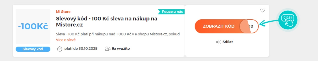 Vyberte si konkrétní slevový kód na naší stránce, který si chcete uplatnit v eshopu Mistore.cz. Klikněte na oranžové tlačítko "Zobrazit kód".