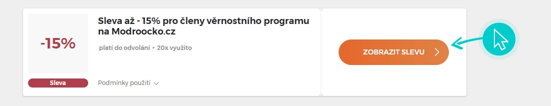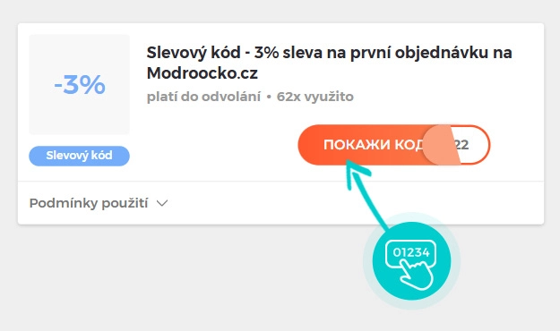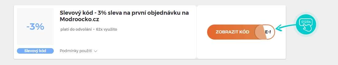 Vyberte si konkrétní slevový kód na naší stránce, který si chcete uplatnit v e-shopu Modroočko.cz. Klikněte na oranžové tlačítko "Zobrazit kód".