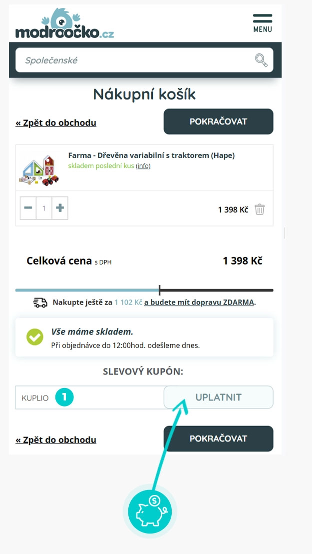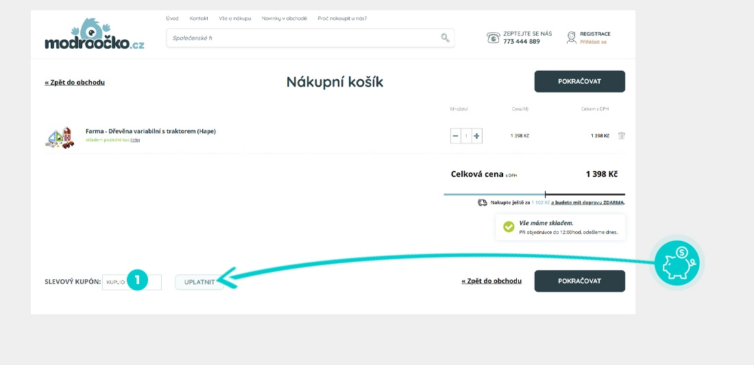 Vyberte si produkt v e-shopu Modroočko.cz, o který máte zájem, stiskněte tlačítko "Přidat do košíku" a produkt se automaticky vloží do nákupního košíku. Přímo v nákupním košíku najdete pod vámi vybraným produktem políčko "Slevový kupón". Zde vložte zkopírovaný slevový kód nebo jej ručně vepište a potvrďte tlačítkem "Uplatnit".
