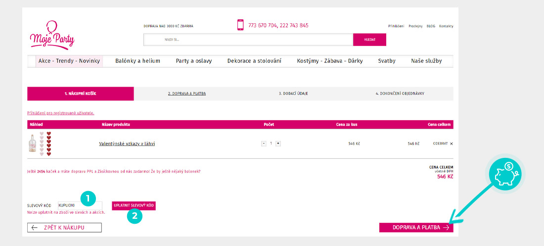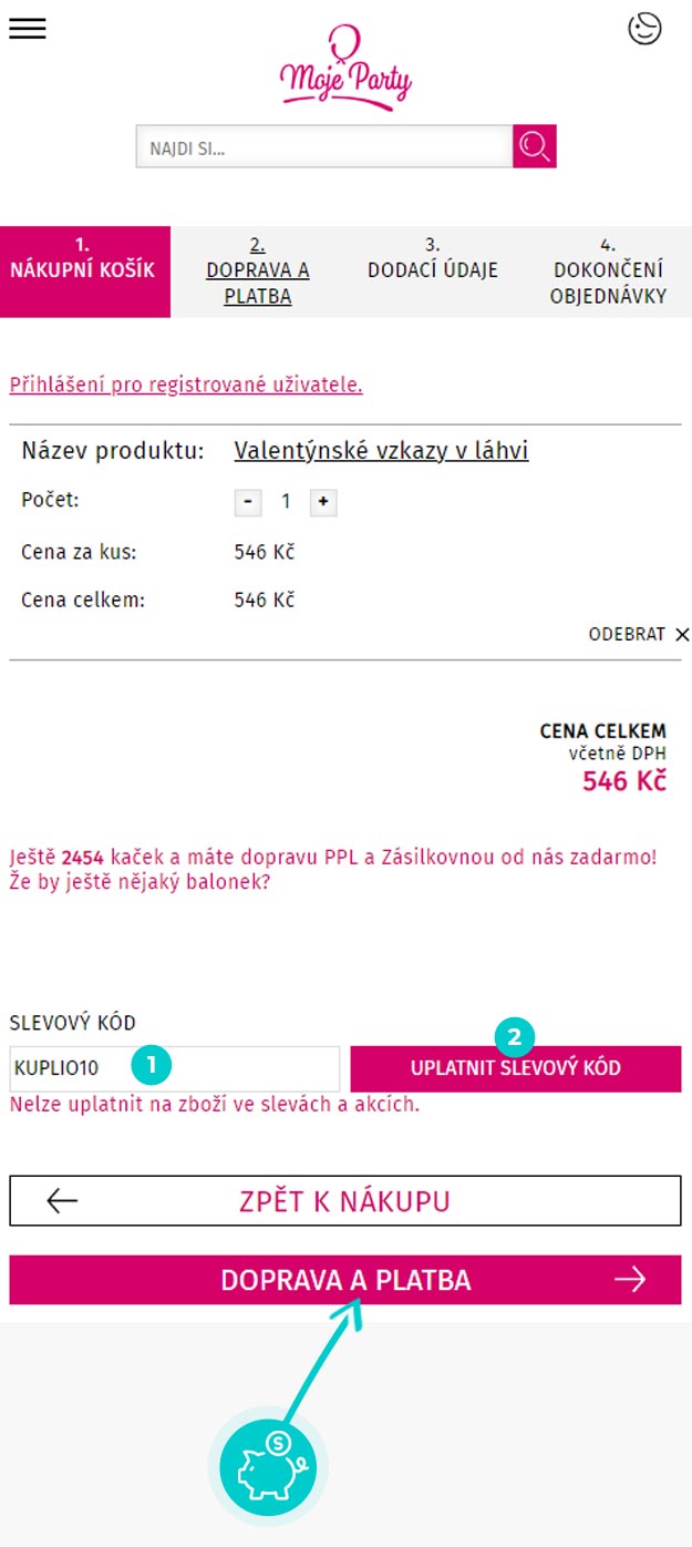 Vyberte si produkt v e-shopu Mojeparty.cz, o který máte zájem, stiskněte tlačítko "Do košíku" a produkt se automaticky vloží do nákupního košíku. Přímo v nákupním košíku najdete pod vámi vybraným produktem políčko "Slevový kód". Zde vložte zkopírovaný slevový kód nebo jej ručně vepište a potvrďte tlačítkem "Uplatnit slevový kód".