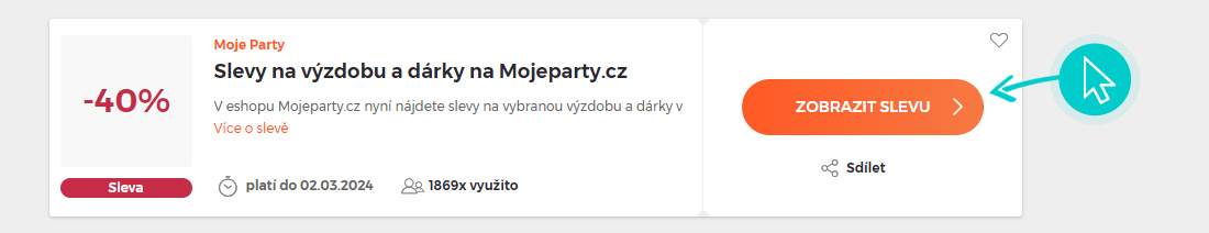 Vyberte si na naší stránce konkrétní Moje Party slevu a klikněte na tlačítko "Získej slevu". Automaticky budete přesměrováni přímo na akční nabídku v internetovém obchodě Mojeparty.cz, kde můžete produkt nakoupit se slevou.