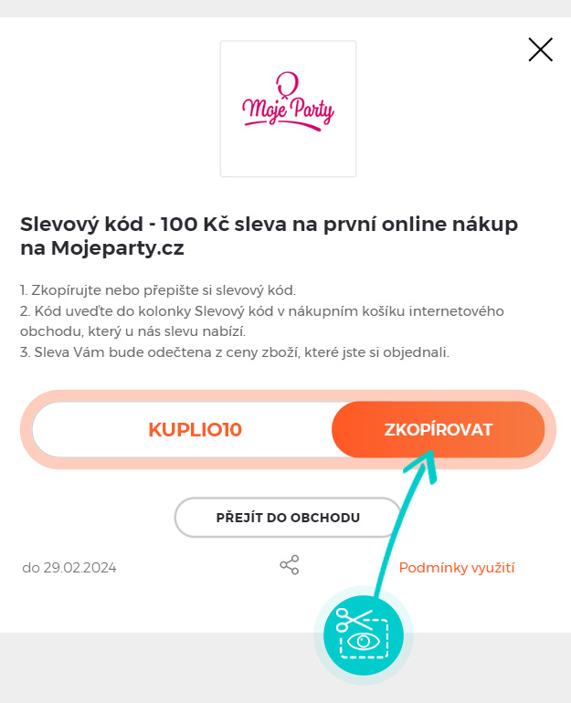 Zkopírujte nebo si opište slevový kód a klikněte na tlačítko "Přejít do obchodu". Následně budete přesměrováni přímo do e-shopu Mojeparty.cz.
