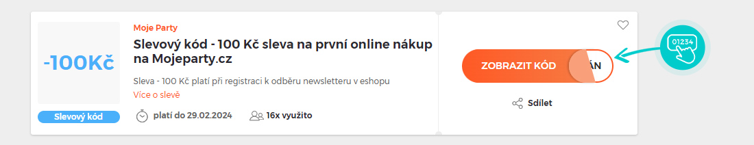 Vyberte si konkrétní slevový kód na naší stránce, který si chcete uplatnit v e-shopu Mojeparty.cz. Klikněte na oranžové tlačítko "Zobrazit kód".