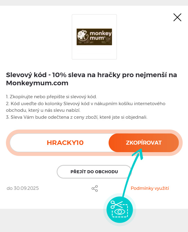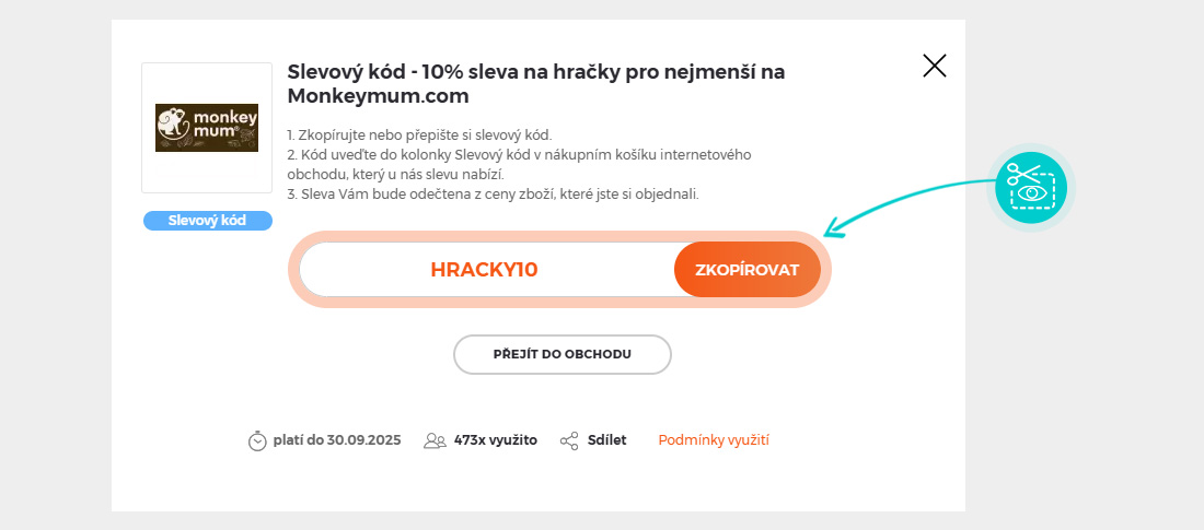 Zkopírujte nebo si opište slevový kód a klikněte na tlačítko "Přejít do obchodu". Následně budete přesměrováni přímo do eshopu monkeymum.com.