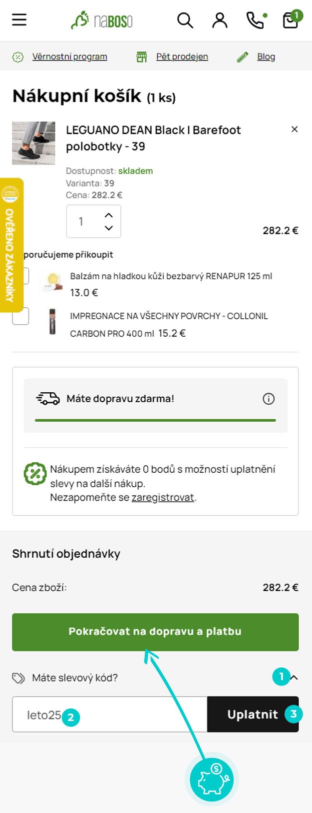 Zkopírujte nebo si opište slevový kód a klikněte na tlačítko "Přejít do obchodu". Následně budete přesměrováni přímo do e-shopu Naboso.cz.