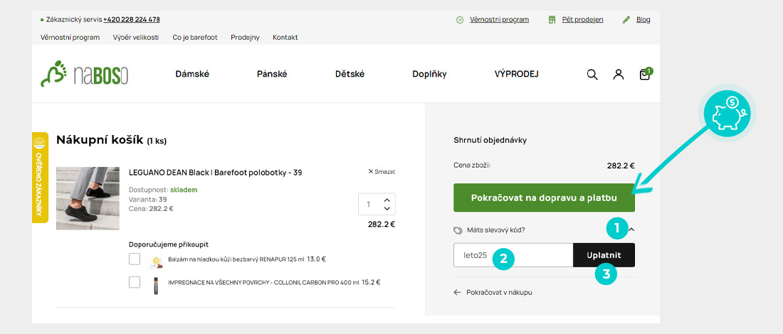 Vyberte si produkt v e-shopu Naboso.cz, o který máte zájem, stiskněte tlačítko "Do košíku" a produkt se automaticky vloží do nákupního košíku. Přímo v nákupním košíku najdete vpravo políčko "Máte slevový kód?". Zde vložte zkopírovaný slevový kód nebo jej ručně vepište a potvrďte tlačítkem "Uplatnit".