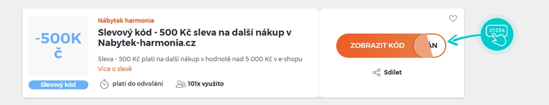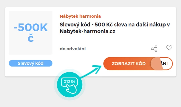 Vyberte si konkrétní slevový kód na naší stránce, který si chcete uplatnit v eshopu Nabytek-harmonia.cz. Klikněte na oranžové tlačítko "Zobrazit kód".
