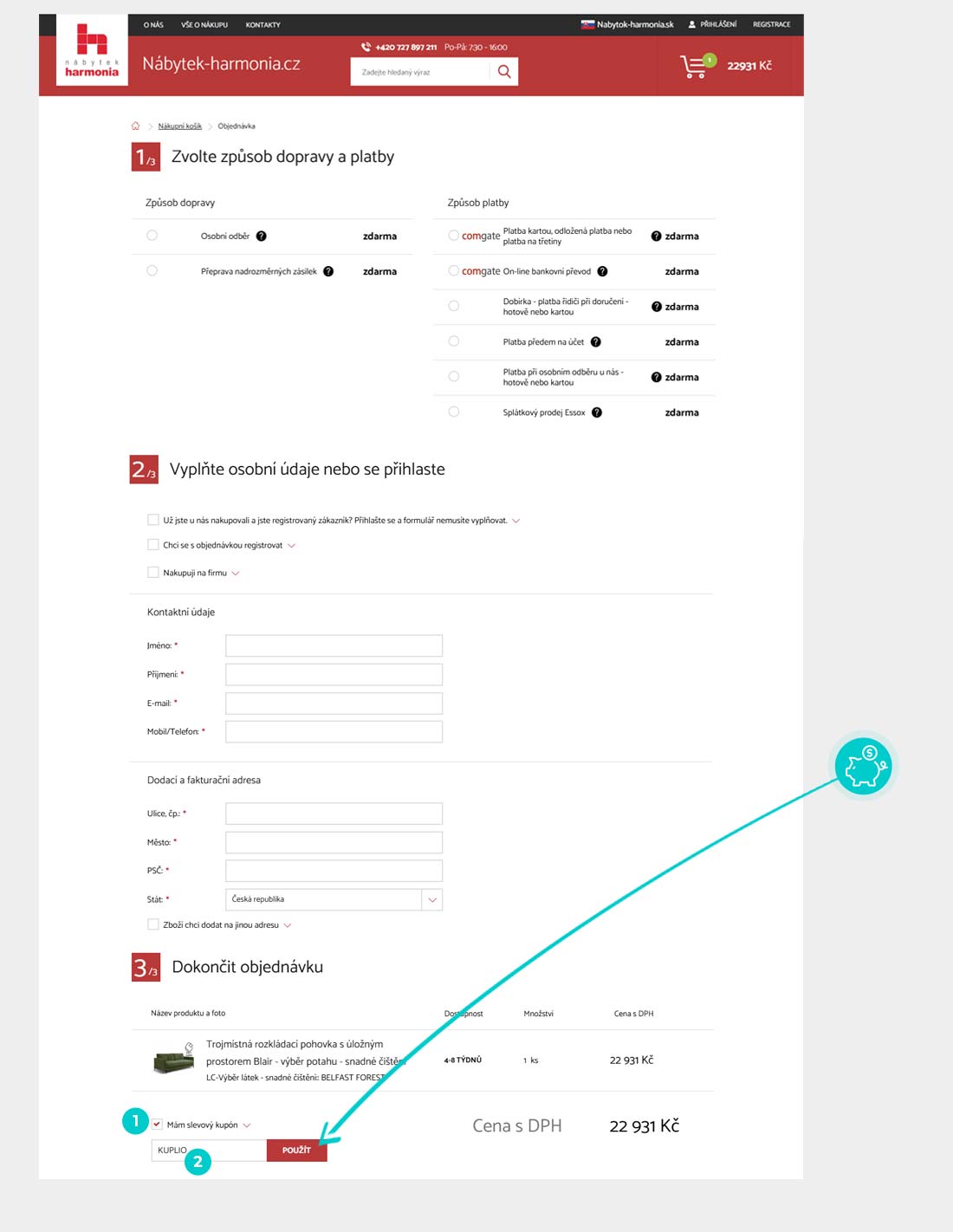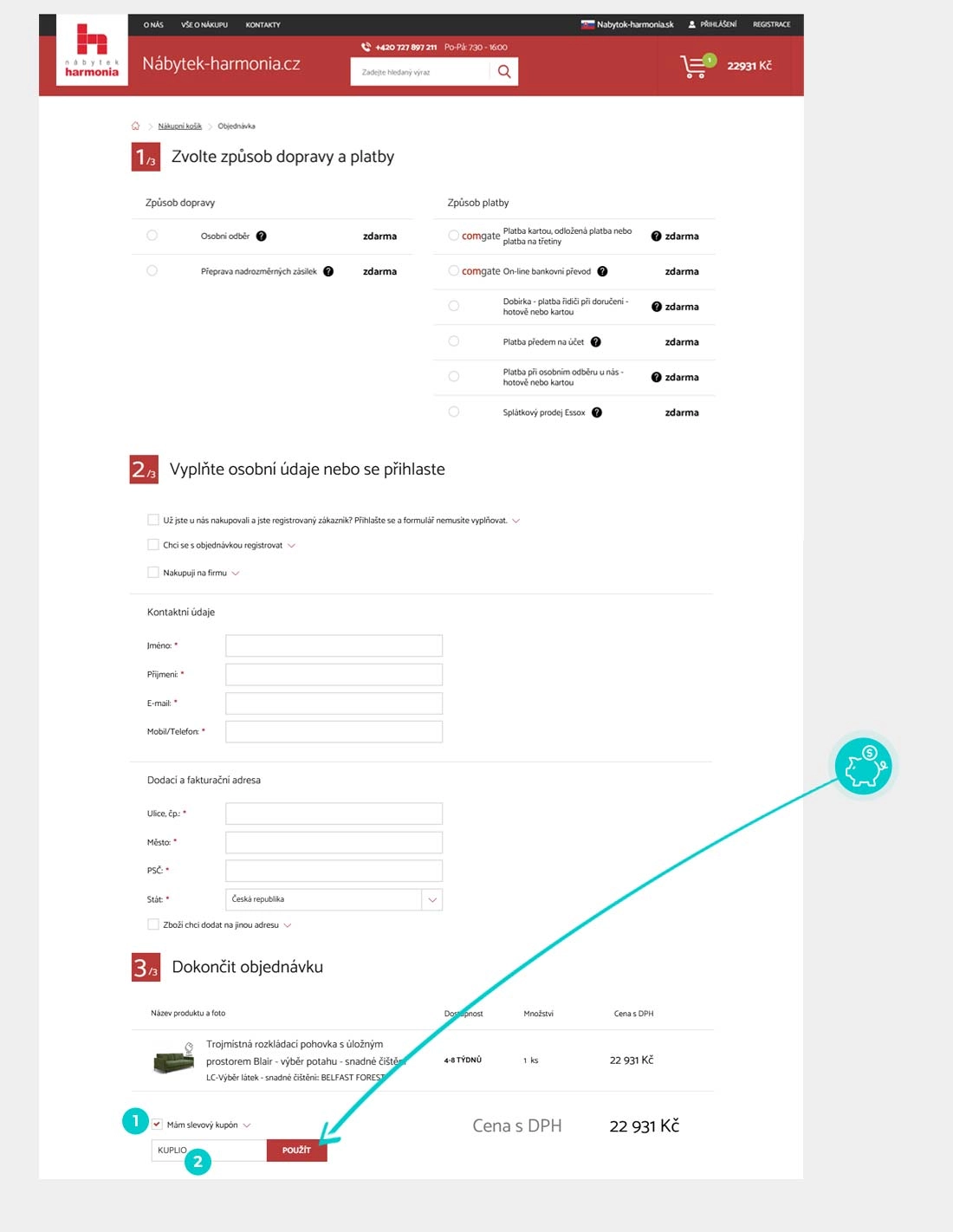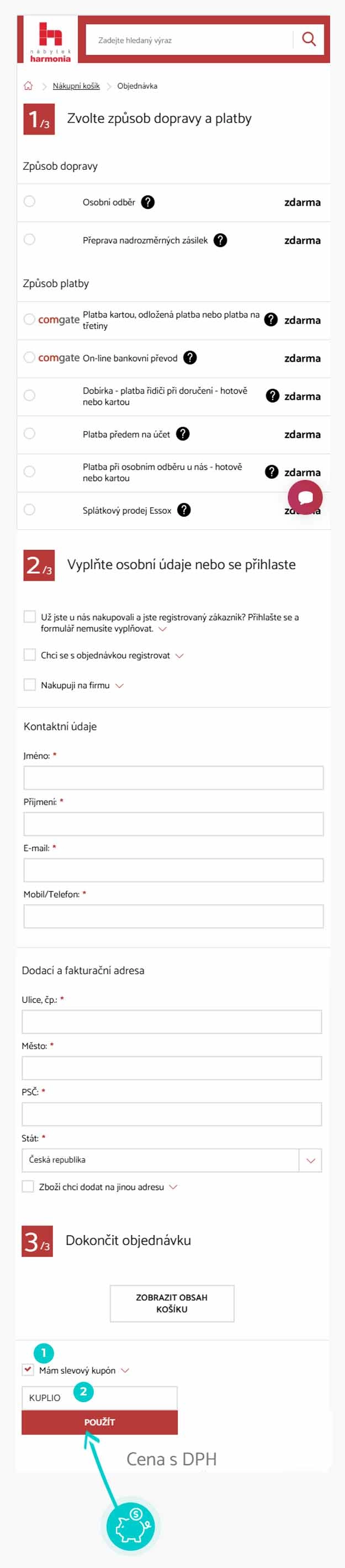 Vyberte si produkt v eshopu Nabytek-harmonia.cz, o který máte zájem, stiskněte tlačítko "Vložit do košíku" a produkt se automaticky vloží do nákupního košíku. Přímo v nákupním košíku pod vybranými produkty v sekci Dokončit objednávku klikněte na políčko "Mám slevový kupón". Zde vložte zkopírovaný slevový kód nebo jej ručně vepište a potvrďte tlačítkem "Použít".
