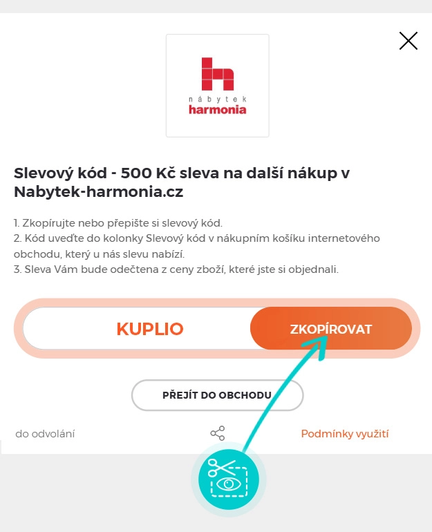 Zkopírujte nebo si opište slevový kód a klikněte na tlačítko "Přejít do obchodu". Následně budete přesměrováni přímo do eshopu Nabytek-harmonia.cz.