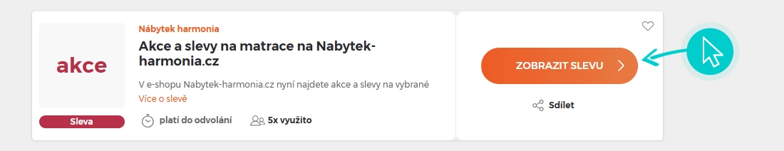 Vyberte si na naší stránce konkrétní Nábytek harmonia slevu a klikněte na tlačítko "Zobrazit slevu". Automaticky budete přesměrováni přímo na akční nabídku v internetovém obchodě Nabytek-harmonia.cz, kde můžete produkt nakoupit se slevou.