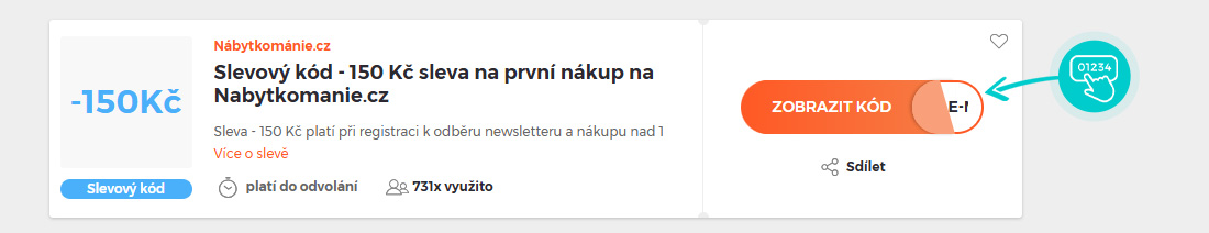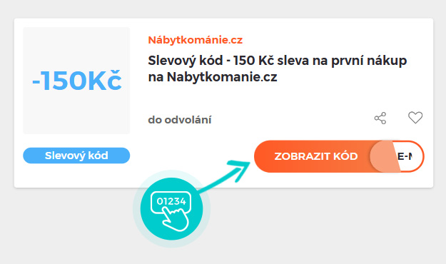 Vyberte si konkrétní slevový kód na naší stránce, který si chcete uplatnit v eshopu nabytkomanie.cz. Klikněte na oranžové tlačítko "Zobrazit kód".