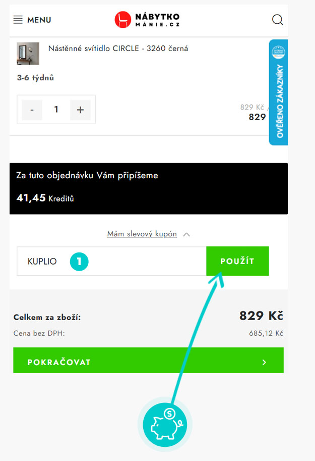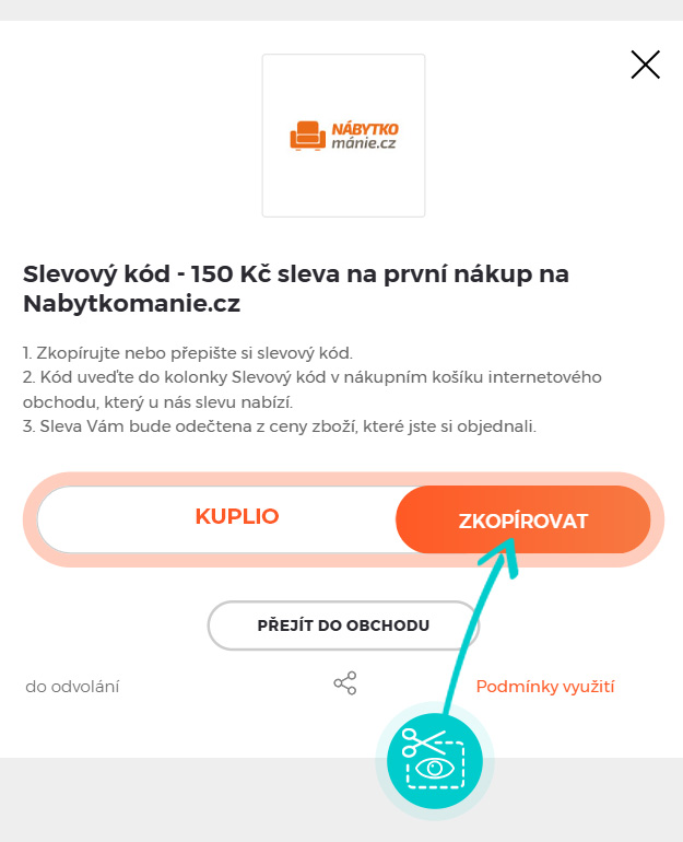 Zkopírujte nebo si opište slevový kód a klikněte na tlačítko "Přejít do obchodu". Následně budete přesměrováni přímo do eshopu nabytkomanie.cz.