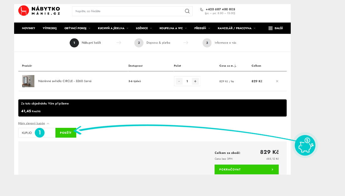 Vyberte si produkt v eshopu nabytkomanie.cz, o který máte zájem, stiskněte tlačítko "Do košíku" a produkt se automaticky vloží do nákupního košíku. Přímo v nákupním košíku zaklikněte políčko "Mám slevový/dárkový kód". Zde vložte zkopírovaný slevový kód nebo jej ručně vepište a potvrďte tlačítkem "Použít".
