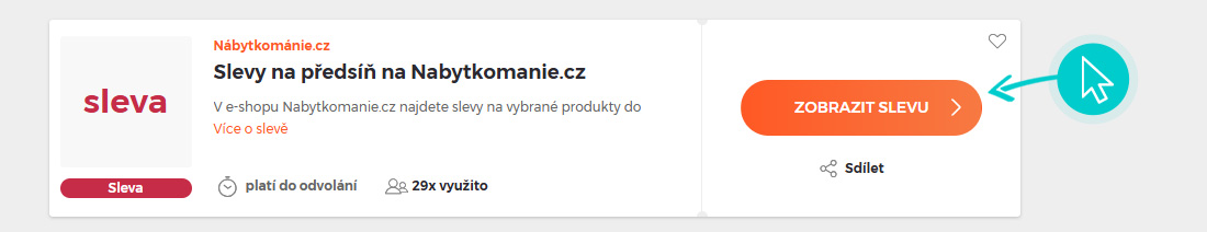 Vyberte si na naší stránce konkrétní Nábytkománie slevu a klikněte na tlačítko "Zobrazit slevu". Automaticky budete přesměrováni přímo na akční nabídku v internetovém obchodě nabytkomanie.cz, kde můžete produkt nakoupit se slevou.