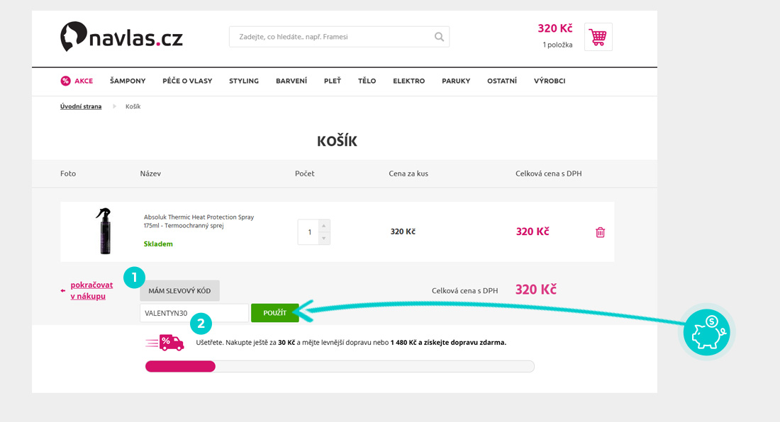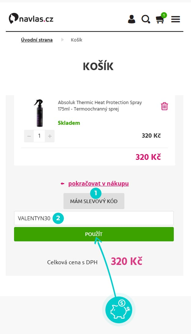 Vyberte si produkt v eshopu navlas.cz, o který máte zájem, stiskněte tlačítko "Vložit do košíku" a produkt se automaticky vloží do nákupního košíku. Přímo v nákupním košíku vedle vybraných produktů klikněte na políčko "Kód poukazu". Zde vložte zkopírovaný slevový kód nebo jej ručně vepište a potvrďte tlačítkem "Uplatnit".