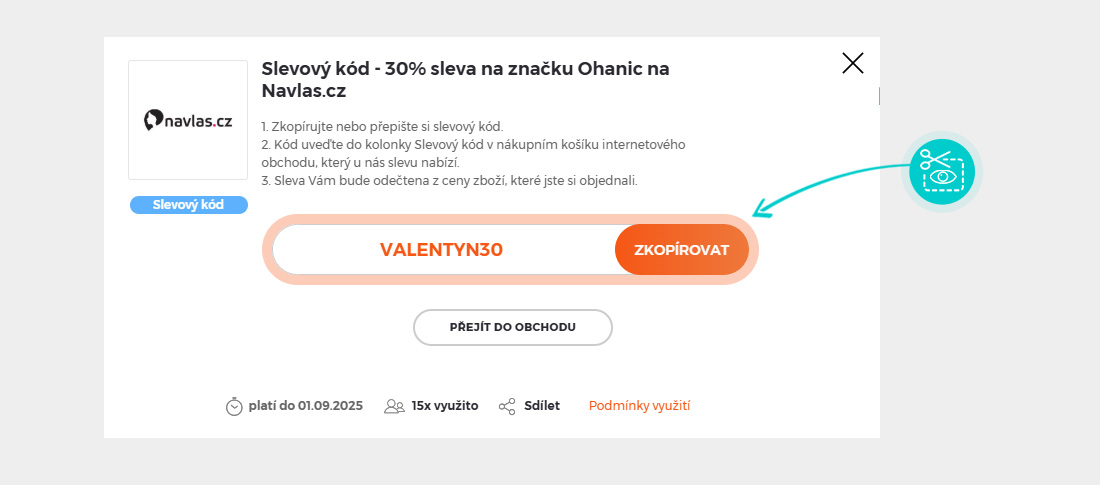 Zkopírujte nebo si opište slevový kód a klikněte na tlačítko "Přejít do obchodu". Následně budete přesměrováni přímo do eshopu navlas.cz.