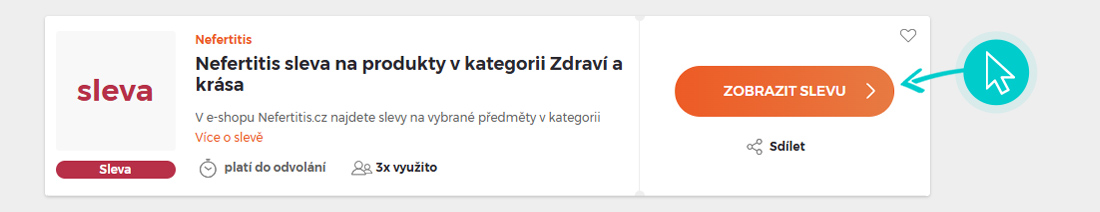 Vyberte si na naší stránce konkrétní Nefertitis slevu a klikněte na tlačítko "Získej slevu". Automaticky budete přesměrováni přímo na akční nabídku v internetovém obchodě Nefertitis.cz, kde můžete produkt nakoupit se slevou.