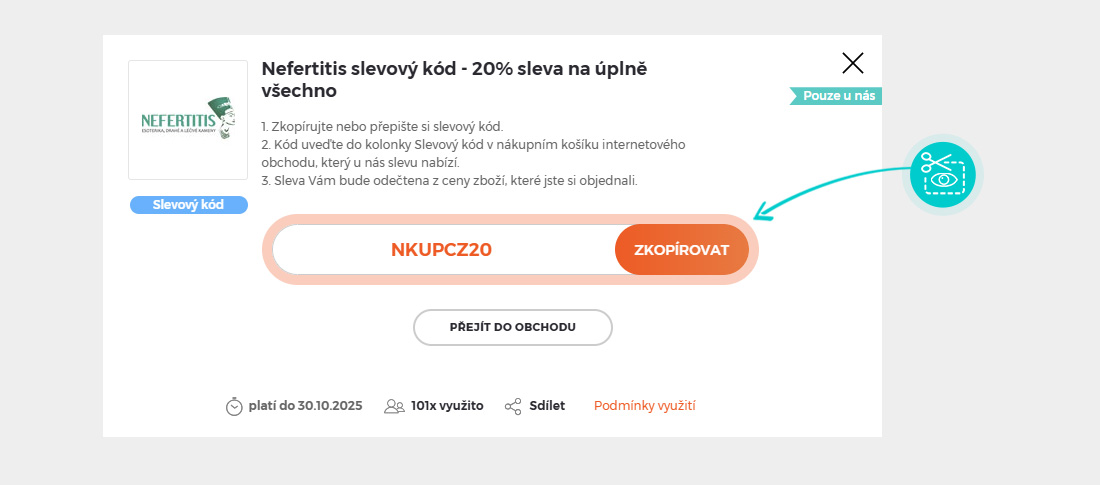 Zkopírujte nebo si opište slevový kód a klikněte na tlačítko "Přejít do obchodu". Následně budete přesměrováni přímo do e-shopu Nefertitis.cz.