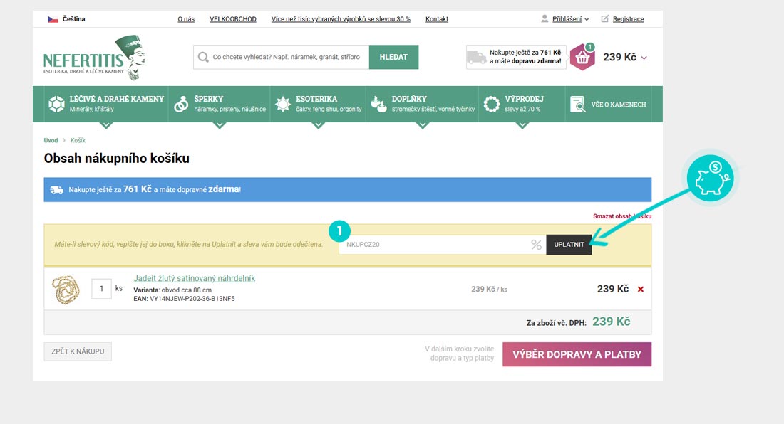 Vyberte si produkt v e-shopu Nefertitis.cz, o který máte zájem, stiskněte tlačítko "Přidat do košíku" a produkt se automaticky vloží do nákupního košíku. Přímo v nákupním košíku najdete pod vámi vybraným produktem políčko "Zadejte slevový kód". Zde vložte zkopírovaný slevový kód nebo jej ručně vepište a potvrďte tlačítkem "Uplatnit".
