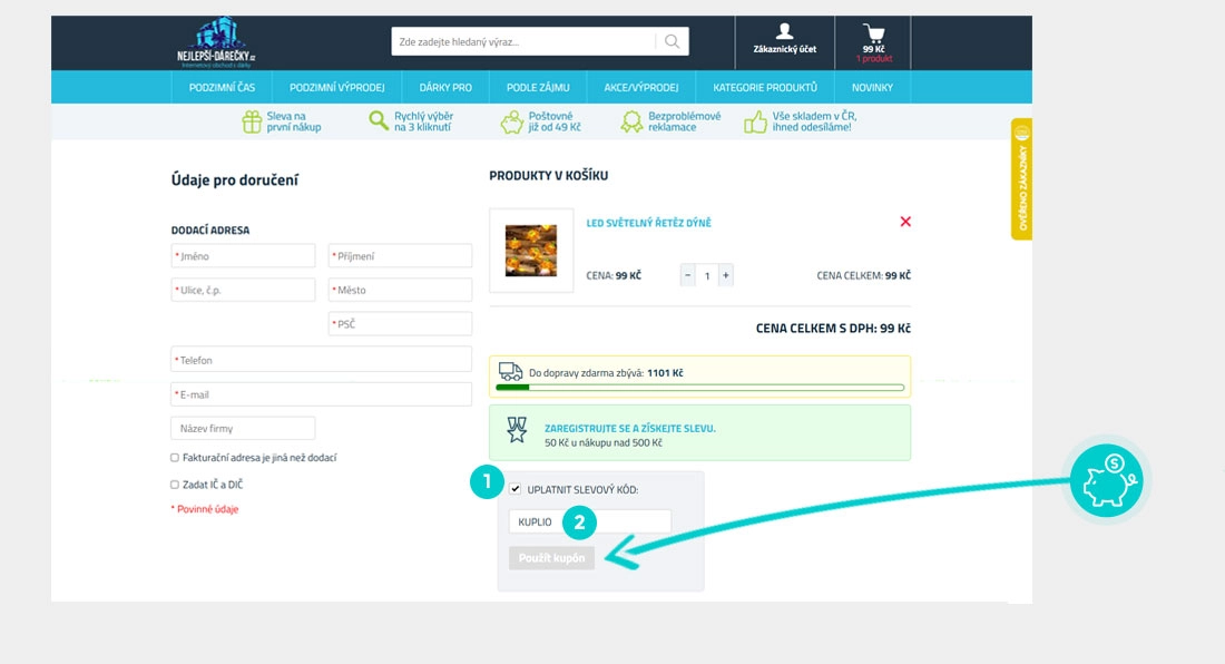 Vyberte si produkt v eshopu Nejlepsi-darecky.cz, o který máte zájem, stiskněte tlačítko "Vložit do košíku" a produkt se automaticky vloží do nákupního košíku. Přímo v nákupním košíku vedle vybraných produktů klikněte na políčko "Kód poukazu". Zde vložte zkopírovaný slevový kód nebo jej ručně vepište a potvrďte tlačítkem "Uplatnit".