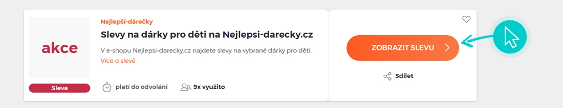 Vyberte si na naší stránce konkrétní Nejlepší-dárečky slevu a klikněte na tlačítko "Zobrazit slevu". Automaticky budete přesměrováni přímo na akční nabídku v internetovém obchodě Nejlepsi-darecky.cz, kde můžete produkt nakoupit se slevou.