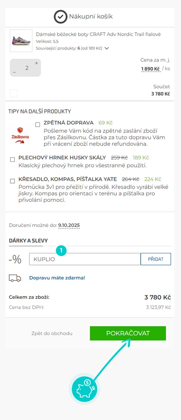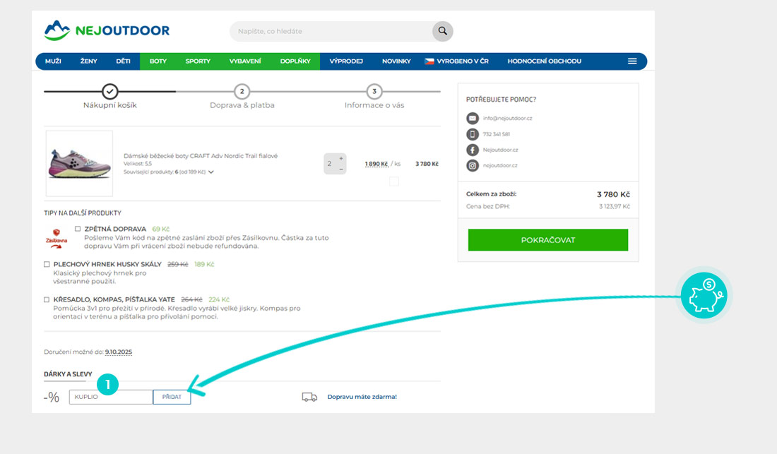 Vyberte si produkt v e-shopu Nejoutdoor.cz, o který máte zájem, stiskněte tlačítko "Přidat do košíku" a produkt se automaticky vloží do nákupního košíku. Přímo v nákupním košíku najdete pod vámi vybraným produktem políčko "Vložit slevový kupón". Zde vložte zkopírovaný slevový kód nebo jej ručně vepište a potvrďte tlačítkem "Přidat".