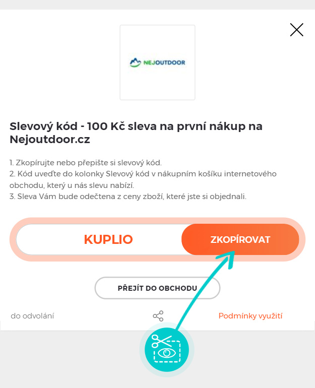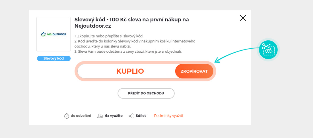Zkopírujte nebo si opište slevový kód a klikněte na tlačítko "Přejít do obchodu". Následně budete přesměrováni přímo do e-shopu Nejoutdoor.cz.