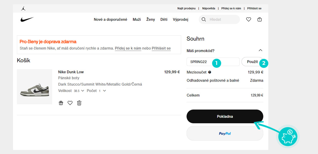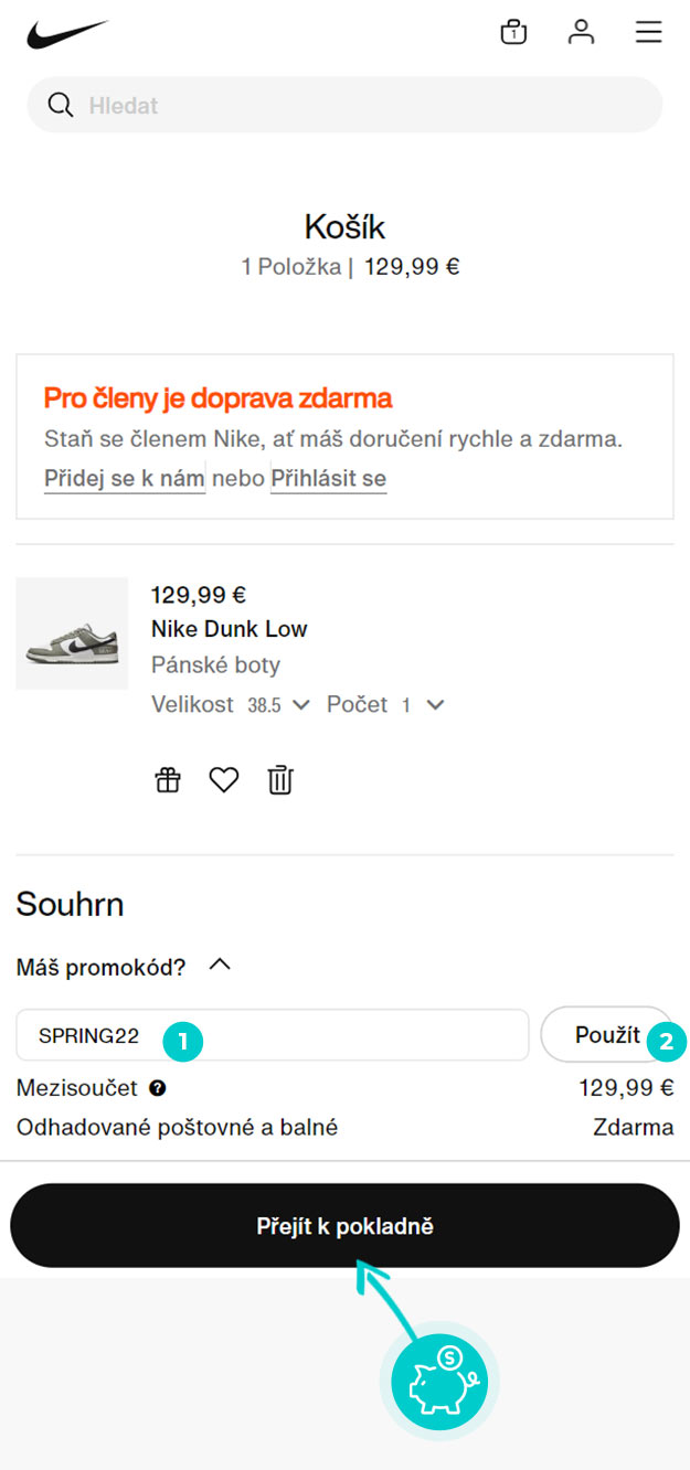 Vyberte si produkt v eshopu Nike.com/cz, o který máte zájem, stiskněte tlačítko "Přidat do košíku" a produkt se automaticky vloží do nákupního košíku. Přímo v nákupním košíku vedle vybraných produktů klikněte na políčko "Máš promokód?". Zde vložte zkopírovaný slevový kód nebo jej ručně vepište a potvrďte tlačítkem "Použít".
