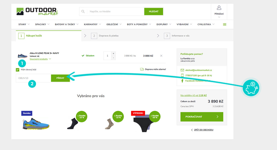 Vyberte si produkt v eshopu outdoormarket.cz, o který máte zájem, stiskněte tlačítko "Vložit do košíku" a produkt se automaticky vloží do nákupního košíku. Přímo v nákupním košíku vedle vybraných produktů klikněte na políčko "Kód poukazu". Zde vložte zkopírovaný slevový kód nebo jej ručně vepište a potvrďte tlačítkem "Uplatnit".