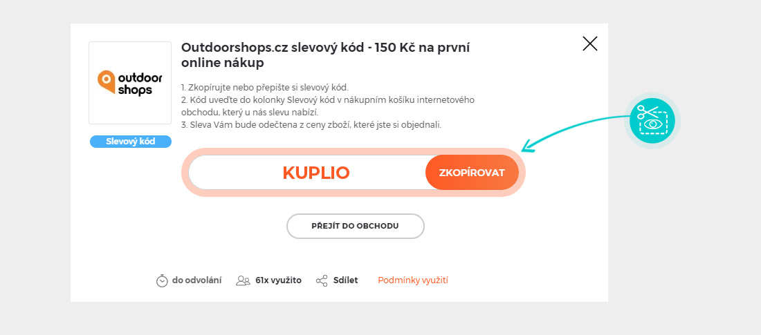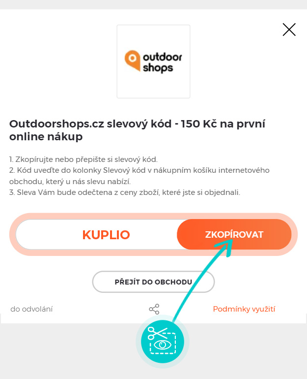 Zkopírujte nebo si opište slevový kód a klikněte na tlačítko "Přejít do obchodu". Následně budete přesměrováni přímo do eshopu outdoorshops.cz.