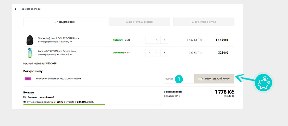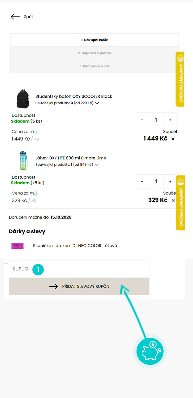 Zkopírujte nebo si opište slevový kód a klikněte na tlačítko "Přejít do obchodu". Následně budete přesměrováni přímo do e-shopu Oxybag.cz.