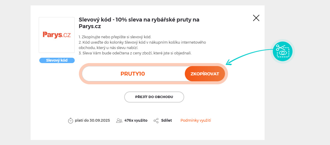 Zkopírujte nebo si opište slevový kód a klikněte na tlačítko "Přejít do obchodu". Následně budete přesměrováni přímo do e-shopu Parys.cz.