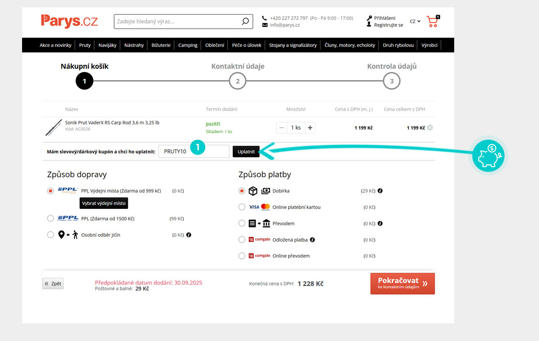 Vyberte si produkt v e-shopu Parys.cz, o který máte zájem, stiskněte tlačítko "Do košíku" a produkt se automaticky vloží do nákupního košíku. Přímo v nákupním košíku pod vybranými produkty najdete políčko "Mám slevový/dárkový kupón a chci ho uplatnit". Zde vložte zkopírovaný slevový kód nebo jej ručně vepište a potvrďte tlačítkem "Uplatnit".