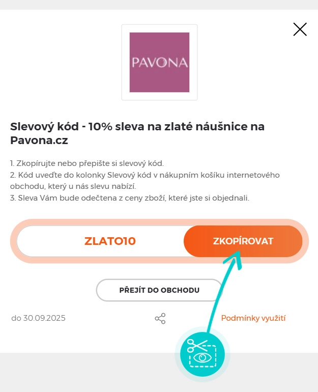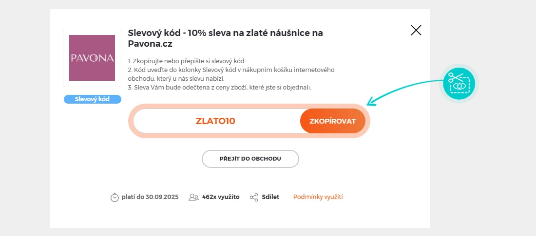 Zkopírujte nebo si opište slevový kód a klikněte na tlačítko "Přejít do obchodu". Následně budete přesměrováni přímo do e-shopu Pavona.cz.