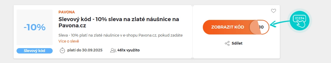 Vyberte si konkrétní slevový kód na naší stránce, který si chcete uplatnit v e-shopu Pavona.cz. Klikněte na oranžové tlačítko "Zobrazit kód".