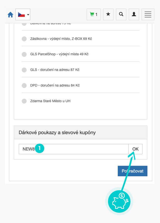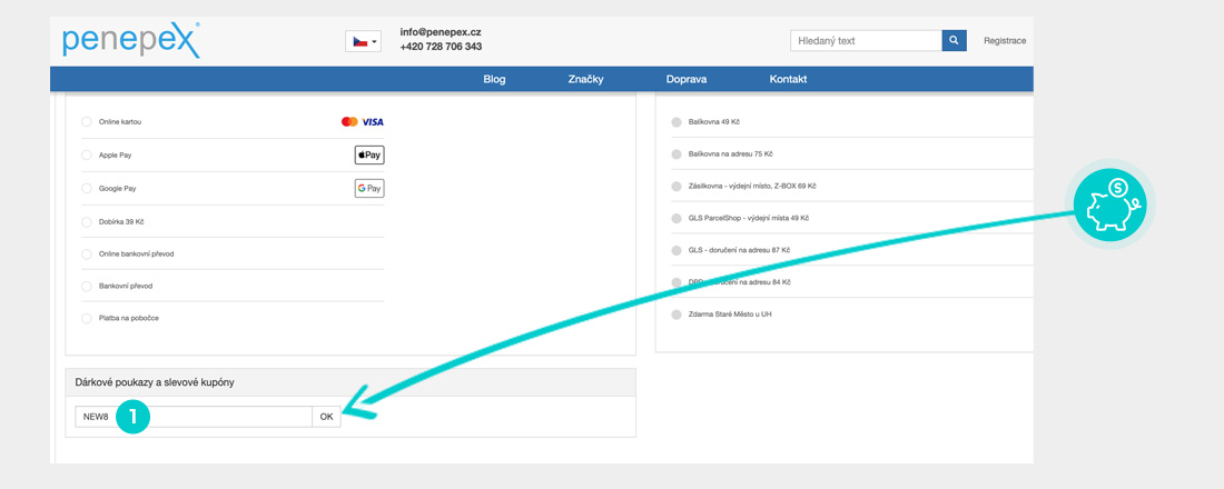 Vyberte si produkt v e-shopu Penepex.cz, o který máte zájem, stiskněte tlačítko "Přidat do košíku" a produkt se automaticky vloží do nákupního košíku. Přímo v nákupním košíku najdete pod vámi vybraným produktem políčko "PKód poukazu". Zde vložte zkopírovaný slevový kód nebo jej ručně vepište a potvrďte tlačítkem "OK".