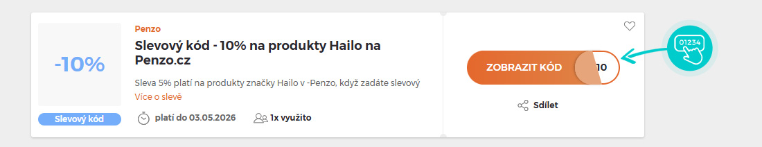 Vyberte si konkrétní slevový kód na naší stránce, který si chcete uplatnit v eshopu penzo.cz. Klikněte na oranžové tlačítko "Zobrazit kód".