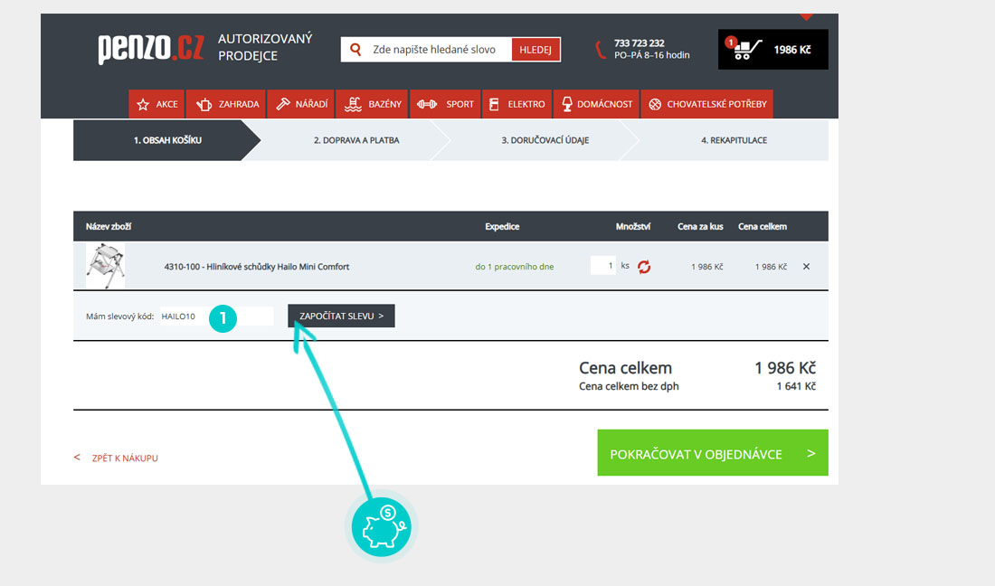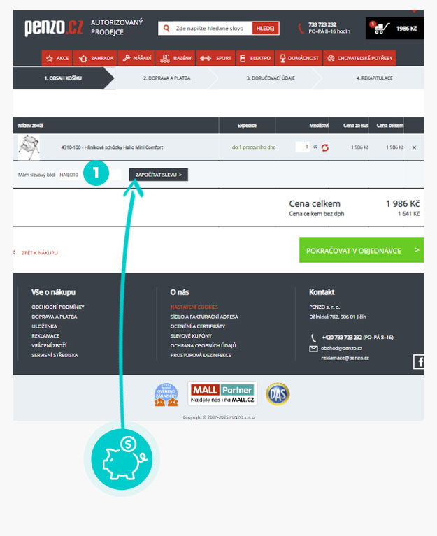 Vyberte si produkt v eshopu penzo.cz, o který máte zájem, stiskněte tlačítko "Do košíku" a produkt se automaticky vloží do nákupního košíku. Přímo v nákupním košíku najdete napravo políčko "Přidat kupón". Zde vložte zkopírovaný slevový kód nebo jej ručně vepište a potvrďte tlačítkem "Přidat".