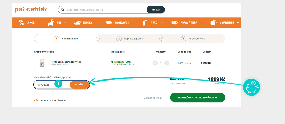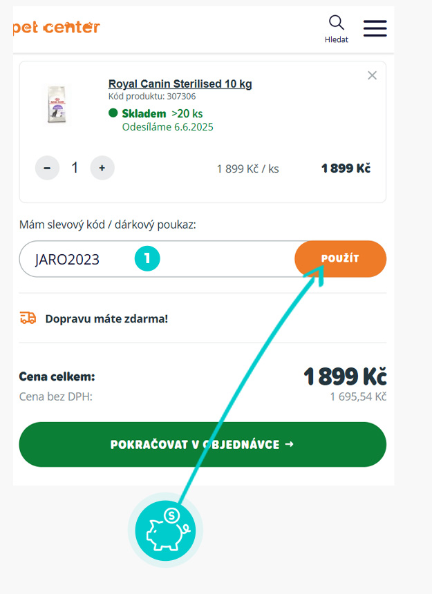 Vyberte si produkt v e-shopu Petcenter.cz, o který máte zájem, stiskněte tlačítko "Přidat do košíku" a produkt se automaticky vloží do nákupního košíku. Přímo v nákupním košíku najdete pod vámi vybraným produktem políčko "Vložit slevový kupón". Zde vložte zkopírovaný slevový kód nebo jej ručně vepište a potvrďte tlačítkem "Použít".