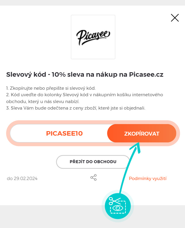 Zkopírujte nebo si opište slevový kód a klikněte na tlačítko "Přejít do obchodu". Následně budete přesměrováni přímo do eshopu Picasee.cz