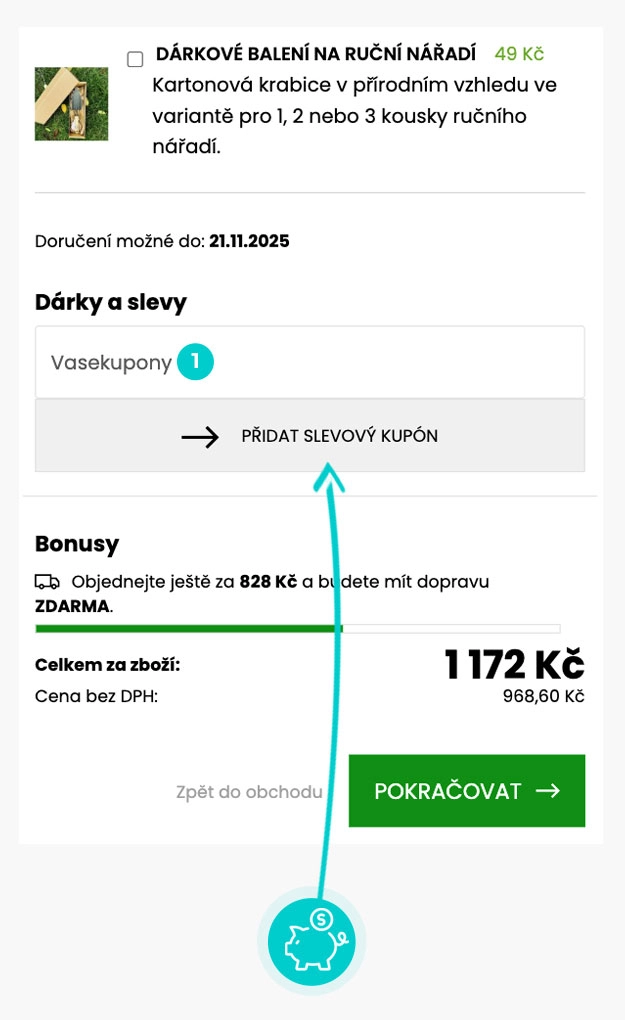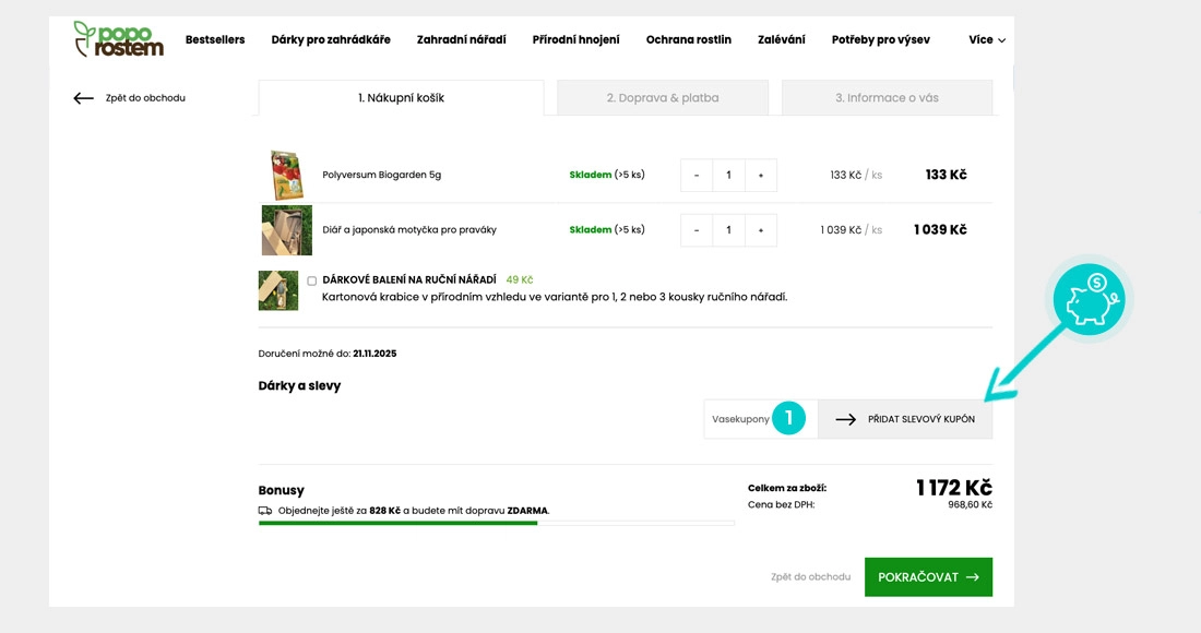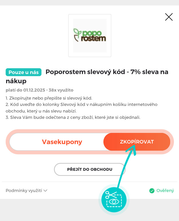 Zkopírujte nebo si opište slevový kód a klikněte na tlačítko "Přejít do obchodu". Následně budete přesměrováni přímo do e-shopu Poporostem.cz.